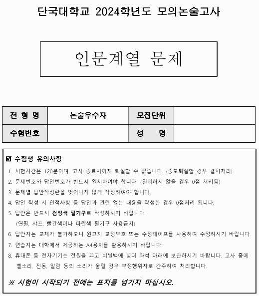 아래는 단국대 논술 관련 자료 원본을 첨부해 두었습니다. 본문 내용이 글자가 작아서 잘 보이지 않으시거나, 직접 단국대 논술 관련 자료를 자세하게 확인하고 싶으신 분들은 첨부 자료를 참고하시길 바랍니다.