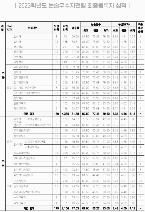 마지막으로 살펴볼 항목은 입시결과 (최저, 등급컷) 관련 내용입니다. 각 모집단위별 모집인원, 지원인원, 경쟁률, 논술점수 (최저, 평균, 최고), 교과 등급 (최저, 평균, 최고) 등은 아래 자료를 참고하시길 바랍니다.