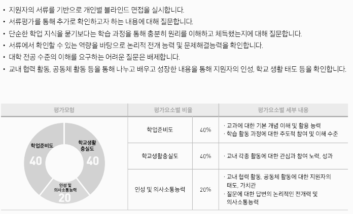 서류에서 확인 가능한 역량을 바탕으로 해당 지원자의 논리적 전개 능력, 문제 해결 능력을 확인하는데 초점을 두며 대학 전공 수준의 이해를 요구하는 너무 어려운 질문은 배제되니 참고하시길 바랍니다. 평가요소별 반영 비율을 보면 학업준비도 40%, 학교생활충실도 40%, 인성 및 의사소통능력 20%으로 구성되어 있는 것을 볼 수 있습니다.