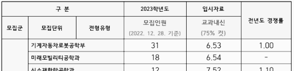 가장 먼저 알아볼 정시등급 유형은 나군입니다. 나군 모집단위에는 기계자동차로봇공학부, 미래모빌리티공학과, 신소재화학공학과, 컴퓨터공학과, IT소프트웨어학과, 전기전자공학과, AI융합보안학과, 건축학과, 토목공학과, 소방방재학과 등이 포함되어 있습니다. 각 모집단위별 모집인원, 경쟁률, 교과 내신 등급컷 (70%컷) 등은 아래 자료를 참고하시길 바랍니다.
